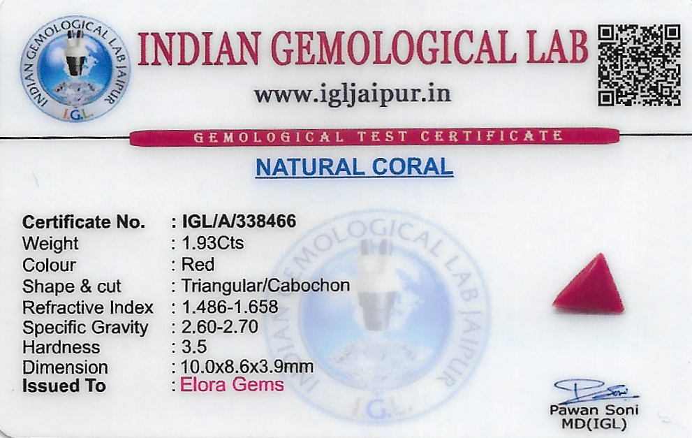 Natural Red Coral (Pavalam) weighing 1.93 carats In Triangular from Italy