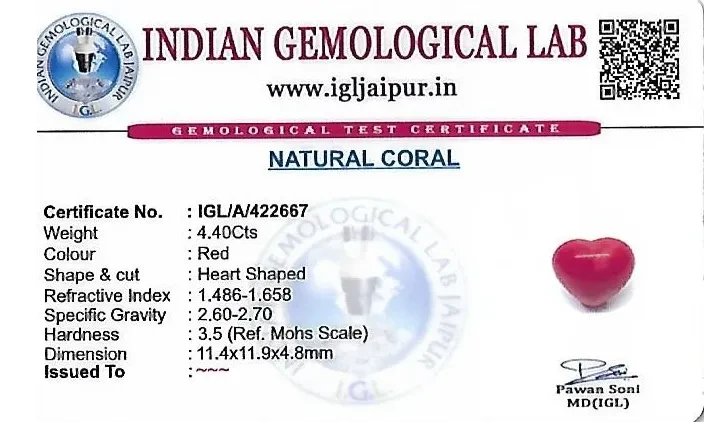 Natural Red Coral (Pavalam) weighing 4.4 carats In Heart from Italy