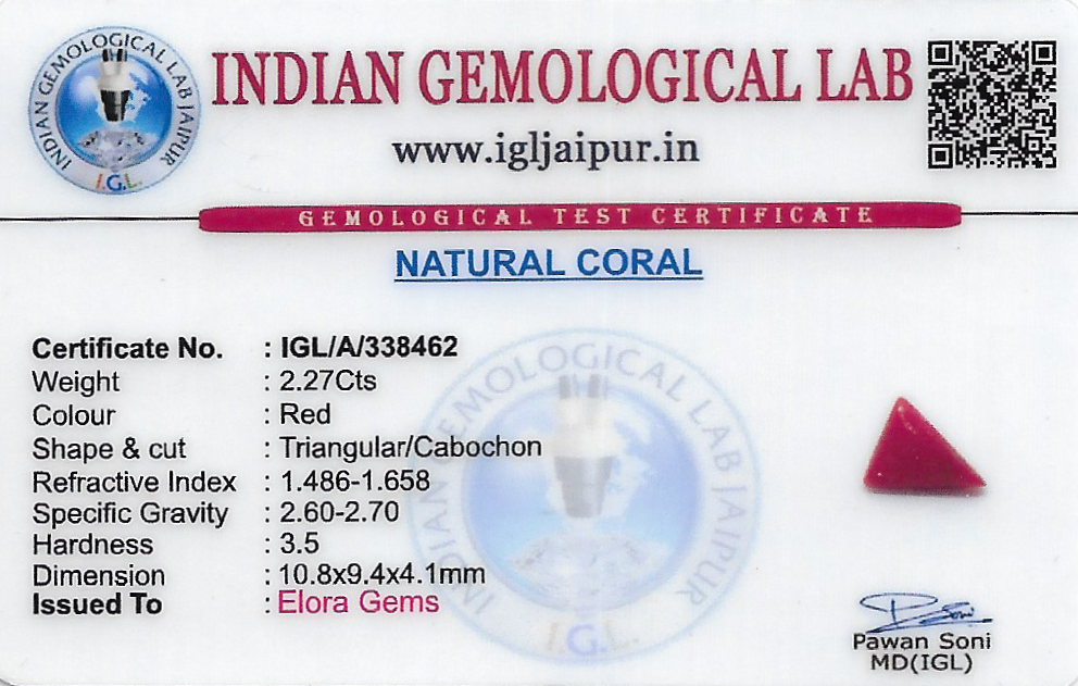 Natural Red Coral (Pavalam) weighing 2.27 carats In Triangular from Italy