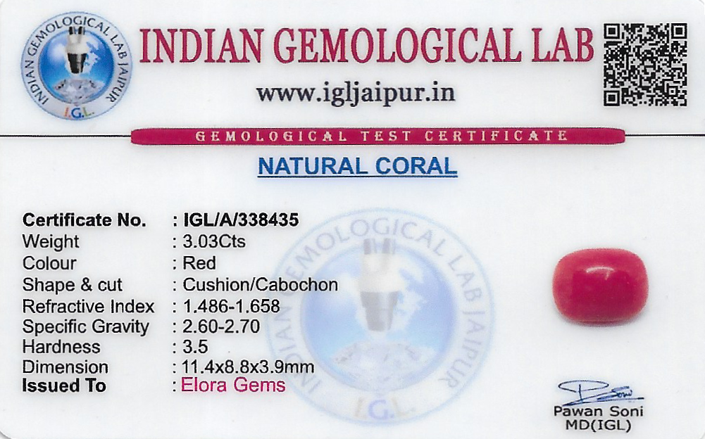 Natural Red Coral (Pavalam) weighing 3.03 carats In Cushion from Japan