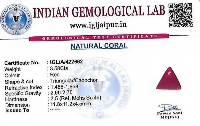 Natural Red Coral (Pavalam) weighing 3.58 carats In Triangular from Italy