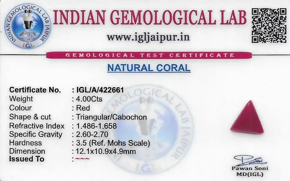 Natural Red Coral (Pavalam) weighing 4 carats In Triangular from Italy