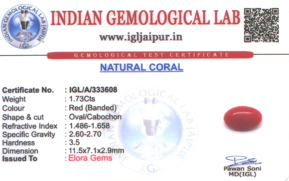 Natural Red Coral (Pavalam) weighing 1.73 carats In Oval from Japan
