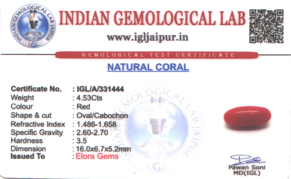 Natural Red Coral (Pavalam) weighing 4.53 carats In Oval from Japan