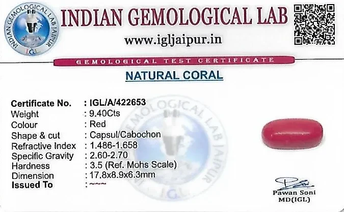 Natural Red Coral (Pavalam) weighing 9.4 carats In Oval from Italy