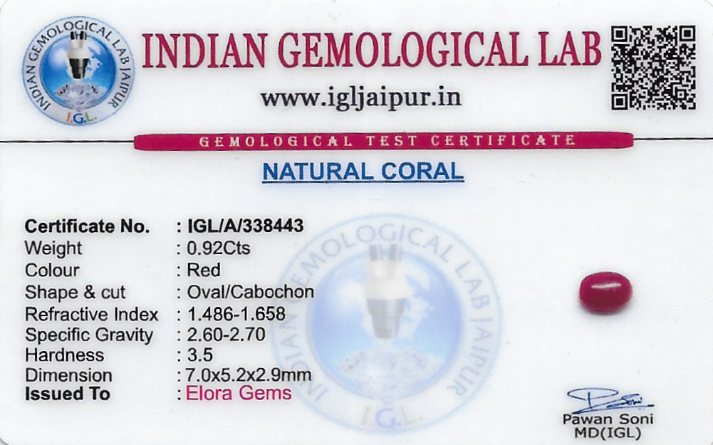 Natural Red Coral (Pavalam) 7x5 MM weighing - 0.92 carats in Oval shape from Japan