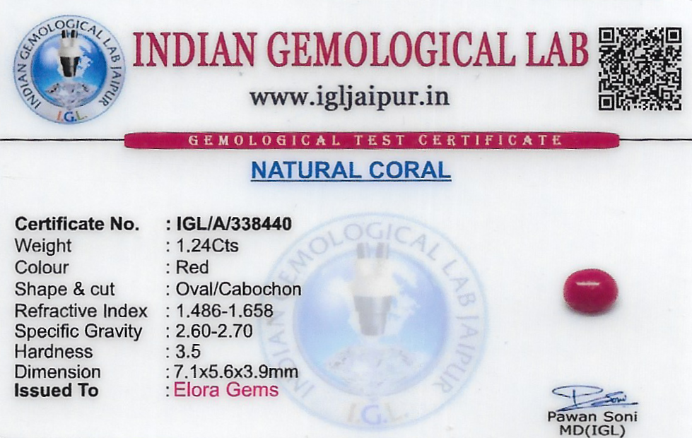 Natural Red Coral (Pavalam) weighing 1.24 carats In Oval from Italy