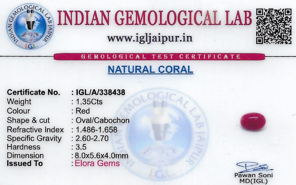 Natural Red Coral (Pavalam) weighing 1.35 carats In Oval from Italy