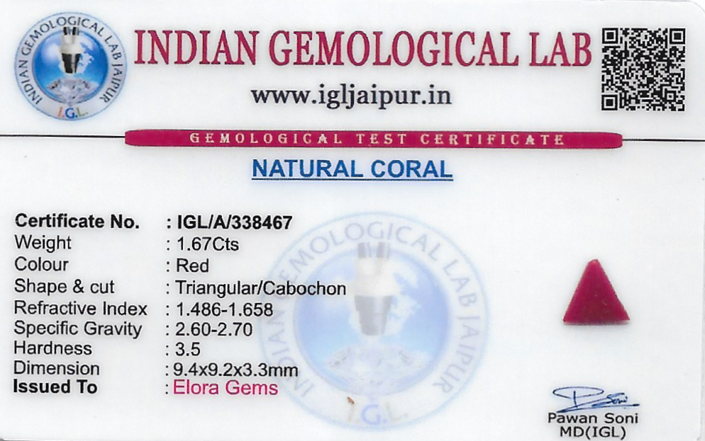 Natural Red Coral (Pavalam) weighing 1.67 carats In Triangular from Italy