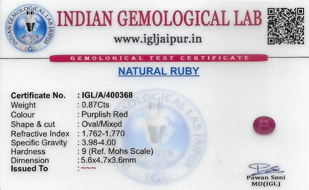 Natural Ruby (Manik) weighing 0.87 carats In Oval from Thailand
