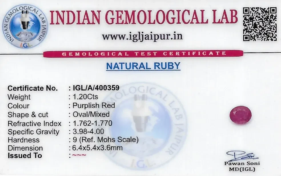 Natural Ruby (Manik) weighing 1.2 carats In Oval from Thailand