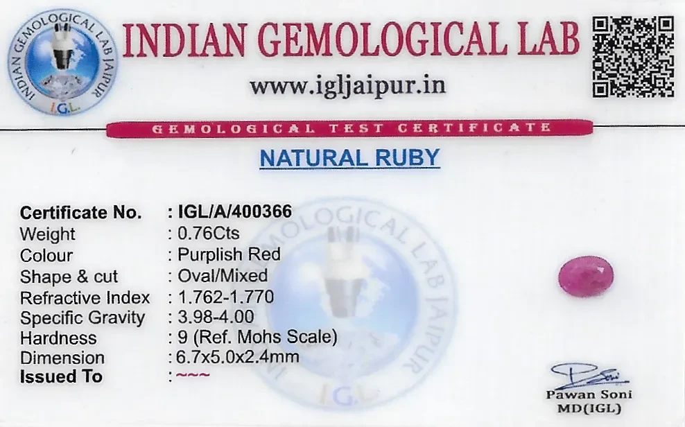 Natural Ruby (Manik) weighing 0.76 carats In Oval from Thailand
