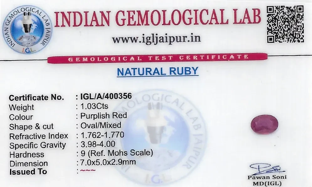 Natural Ruby (Manik) weighing 1.03 carats In Oval from Thailand