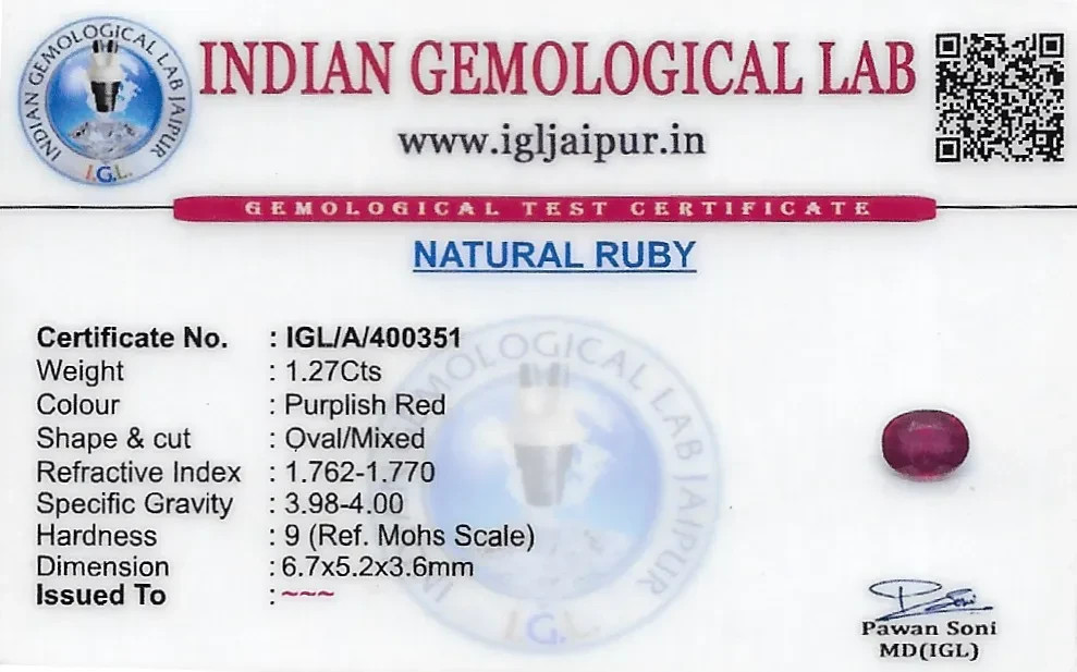 Natural Ruby (Manik) weighing 1.27 carats In Oval from Thailand