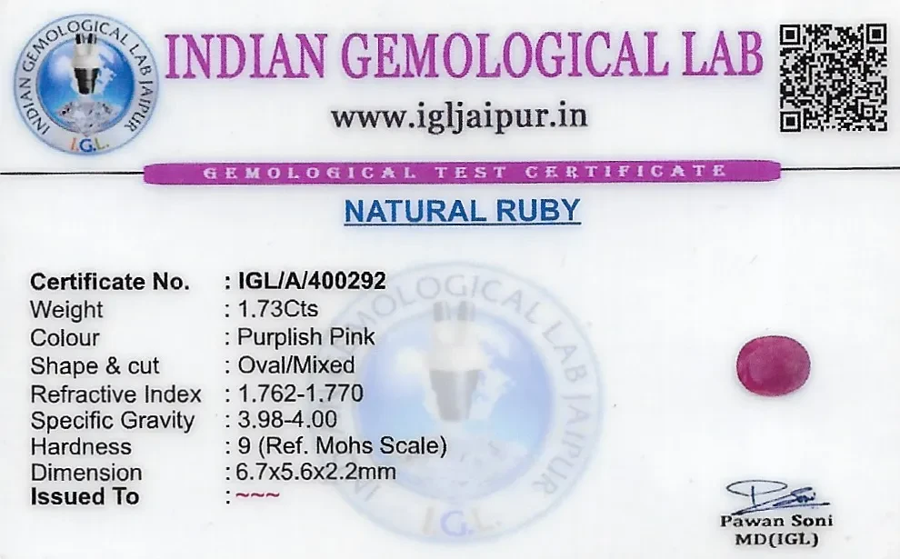 Natural Ruby (Manik) weighing 1.73 carats In Oval from Thailand