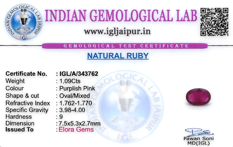 Natural Ruby (Manik) weighing 1.09 carats In Oval from Thailand