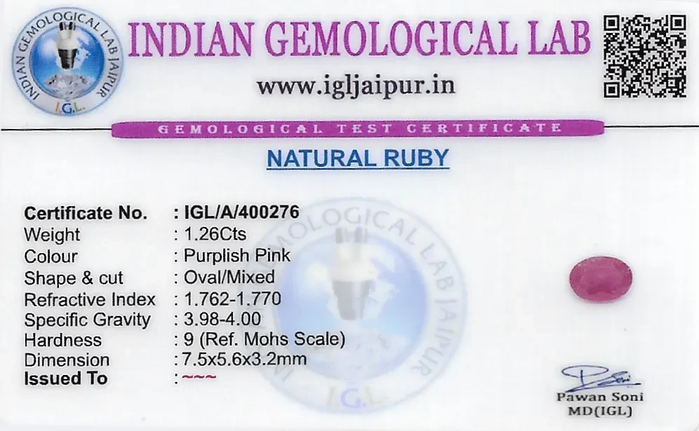 Natural Ruby (Manik) weighing 1.26 carats In Oval from Thailand
