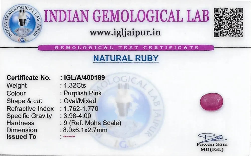 Natural Ruby (Manik) weighing 1.32 carats In Oval from Thailand