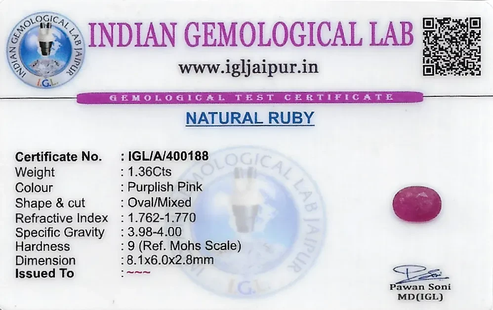 Natural Ruby (Manik) weighing 1.36 carats In Oval from Thailand