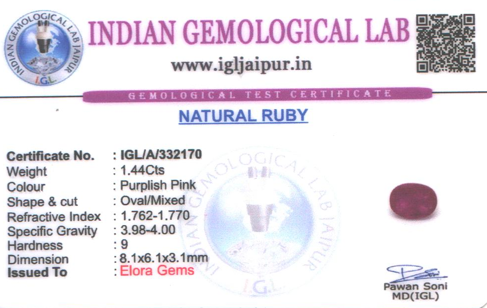Natural Ruby (Manik) weighing 1.44 carats In Oval from Thailand