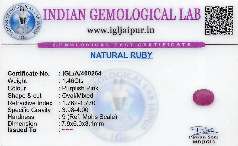 Natural Ruby (Manik) weighing 1.46 carats In Oval from Thailand
