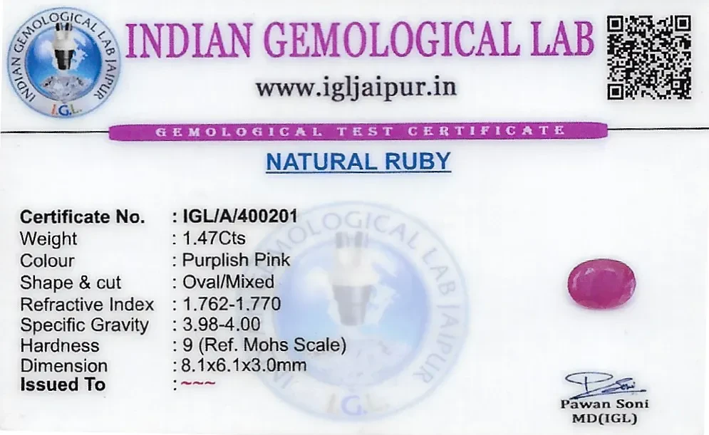 Natural Ruby (Manik) weighing 1.47 carats In Oval from Thailand