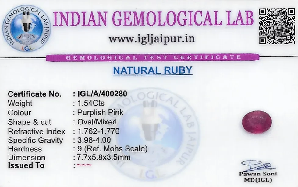 Natural Ruby (Manik) weighing 1.54 carats In Oval from Thailand