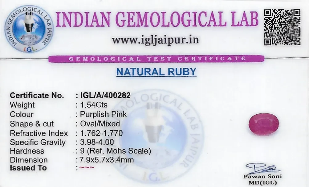 Natural Ruby (Manik) weighing 1.54 carats In Oval from Thailand