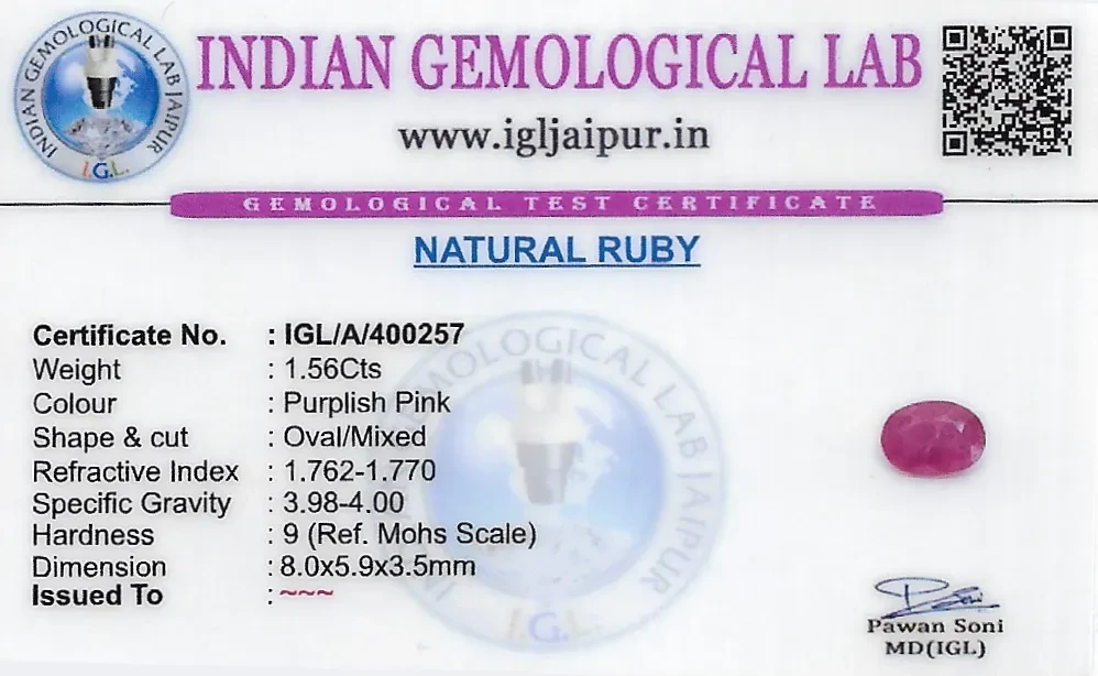 Natural Ruby (Manik) weighing 1.56 carats In Oval from Thailand