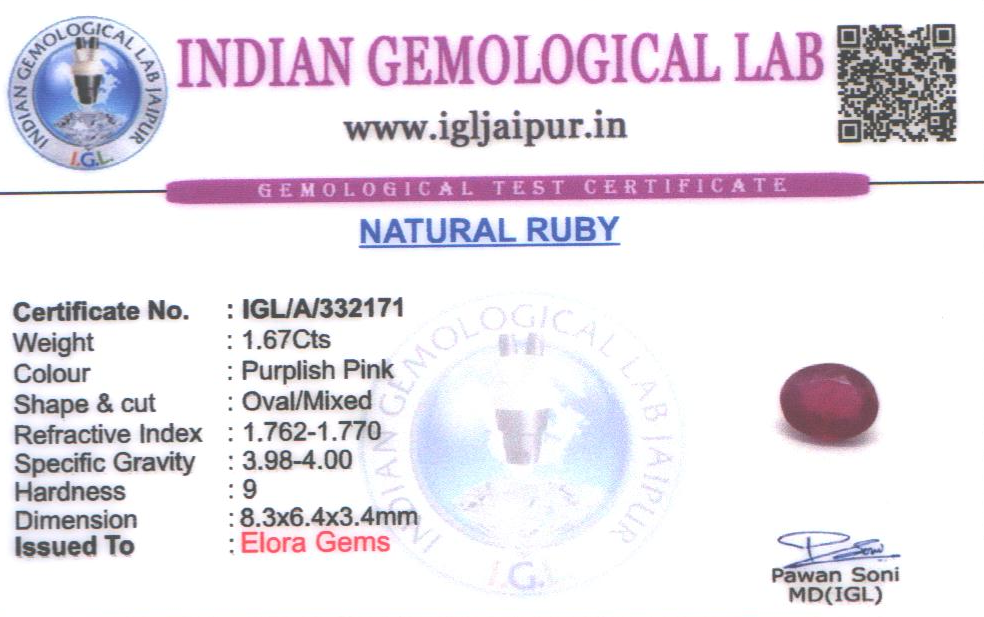 Natural Ruby (Manik) weighing 1.67 carats In Oval from Thailand