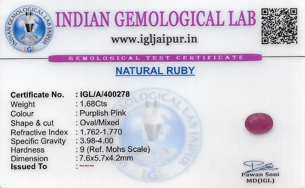 Natural Ruby (Manik) weighing 1.68 carats In Oval from Thailand