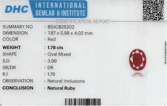 Natural Ruby (Manik) weighing 1.78 carats In Oval