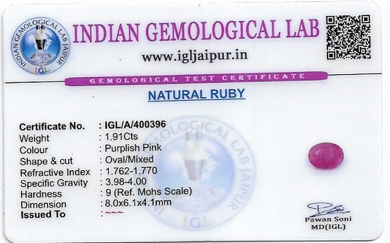Natural Ruby (Manik) weighing 1.91 carats In Oval from Africa