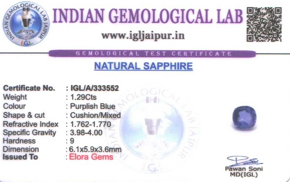 Natural Sapphire weighing 1.29 carats In Cushion from Sri Lanka (Ceylon)