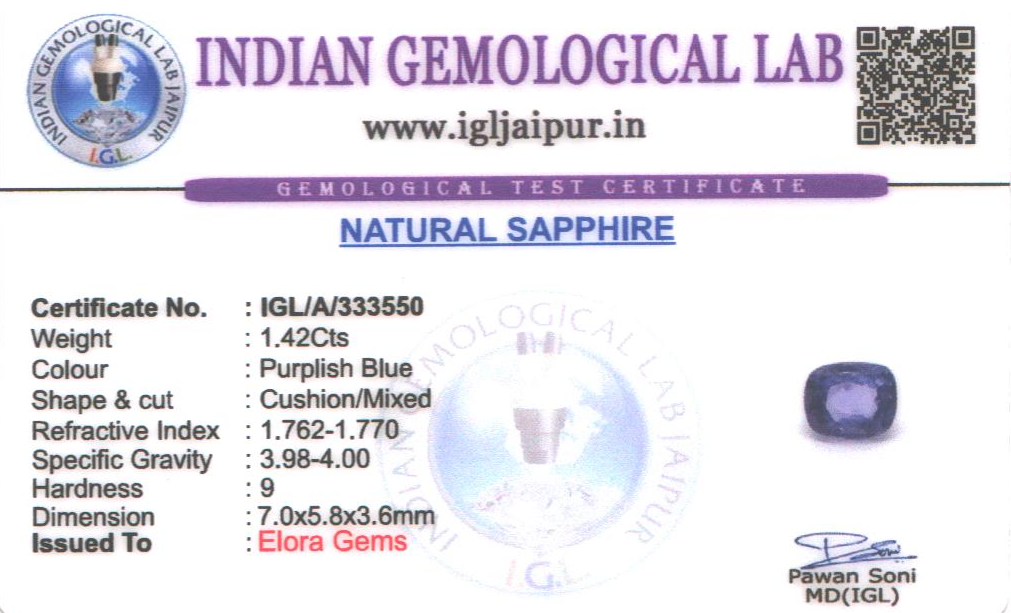 Natural Sapphire weighing 1.42 carats In Cushion from Sri Lanka (Ceylon)
