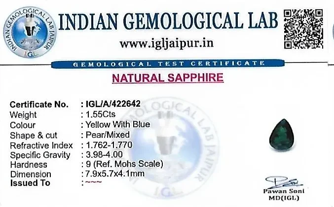 Natural Sapphire weighing 1.55 carats In Pear from Thailand