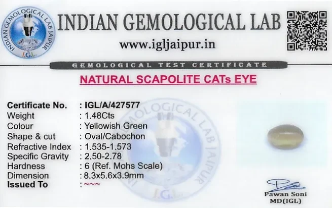 Natural Scapolite Cat's Eye weighing 1.48 carats In Oval