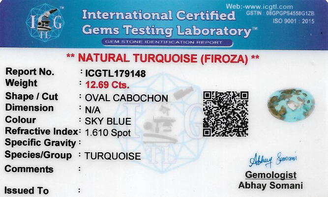 Natural Turquoise weighing 12.69 carats In Oval from USA