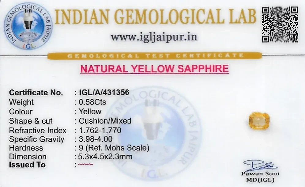 Natural Yellow Sapphire (Pukhraj) weighing 0.58 carats In Cushion from Sri Lanka (Ceylon)