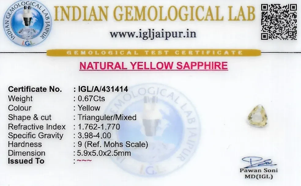 Natural Yellow Sapphire (Pukhraj) weighing 0.67 carats In Triangular from Sri Lanka (Ceylon)
