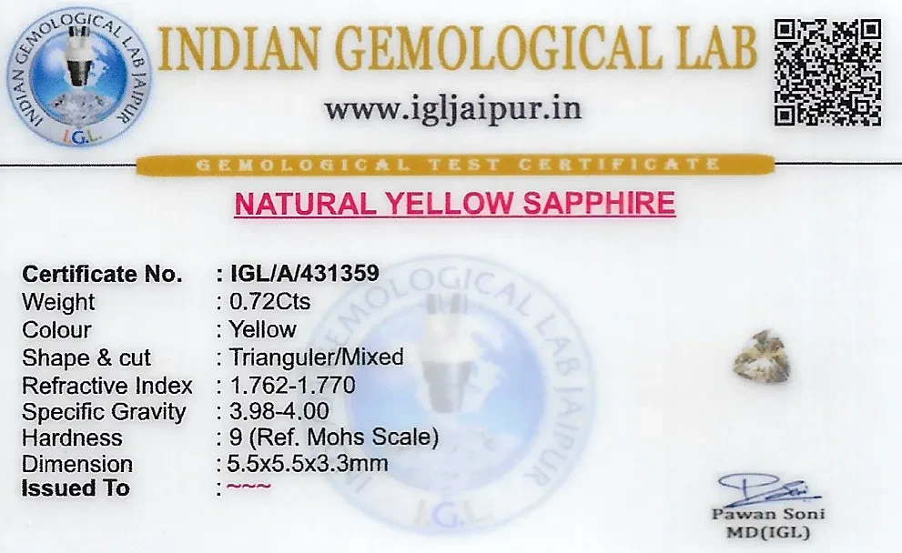 Natural Yellow Sapphire (Pukhraj) weighing 0.72 carats In Triangular from Sri Lanka (Ceylon)