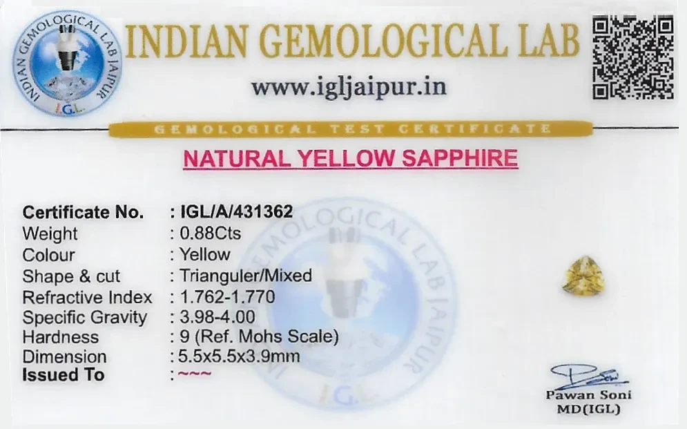 Natural Yellow Sapphire (Pukhraj) weighing 0.88 carats In Triangular from Sri Lanka (Ceylon)