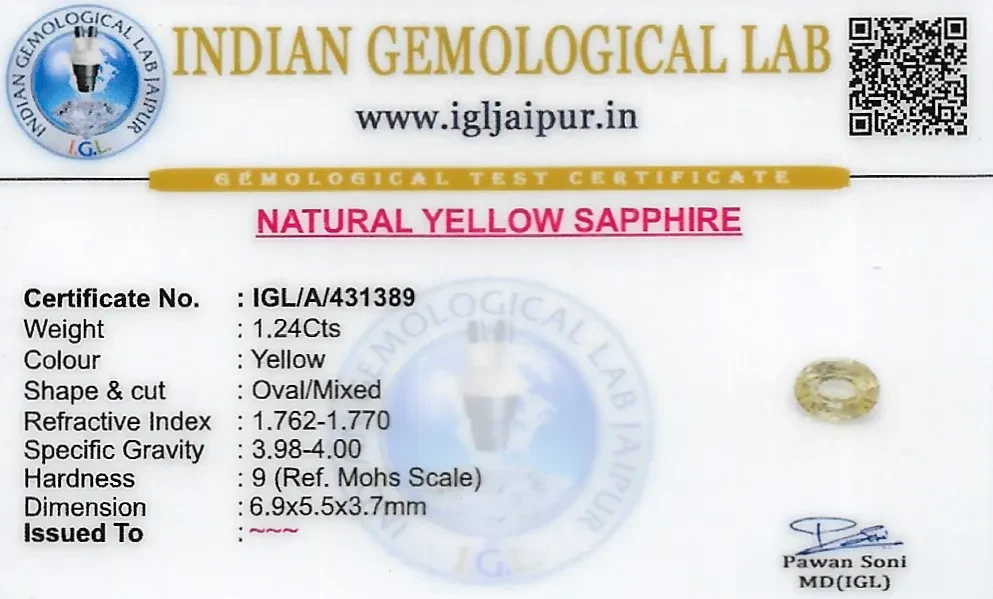 Natural Yellow Sapphire (Pukhraj) weighing 1.24 carats In Oval from Sri Lanka (Ceylon)