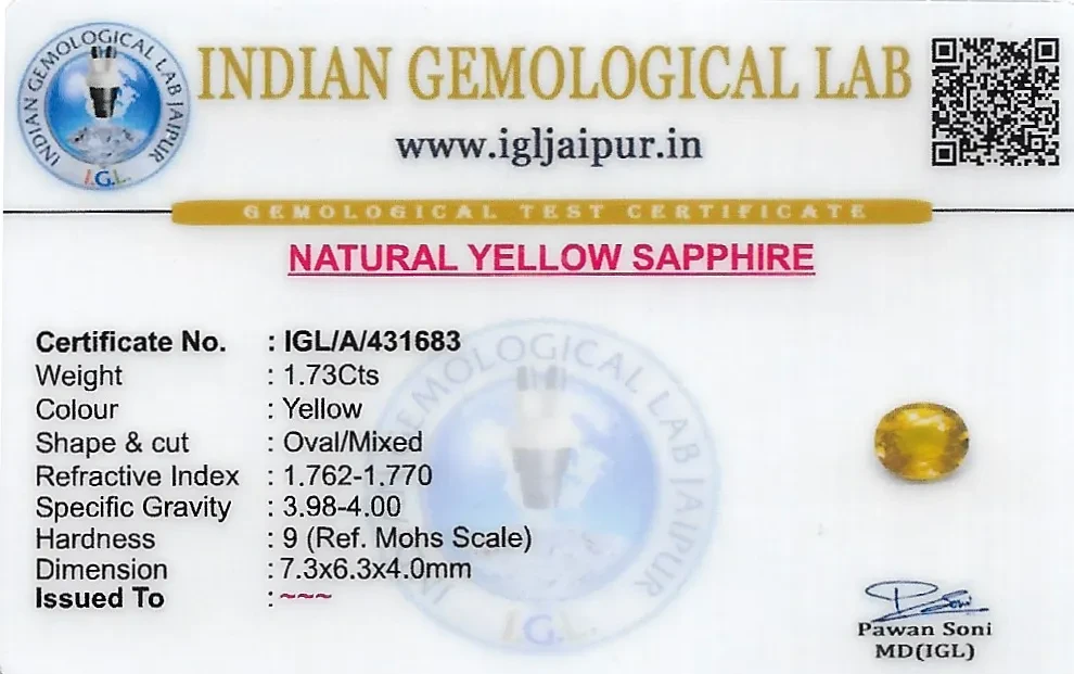 Natural Yellow Sapphire (Pukhraj) weighing 1.73 carats In Oval from Thailand