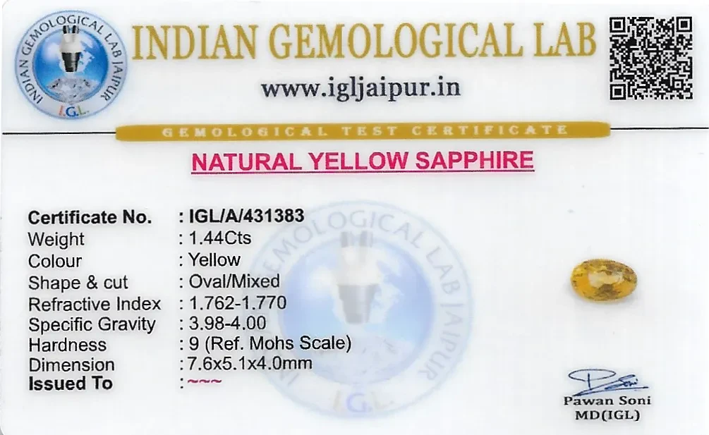 Natural Yellow Sapphire (Pukhraj) weighing 1.44 carats In Oval from Sri Lanka (Ceylon)