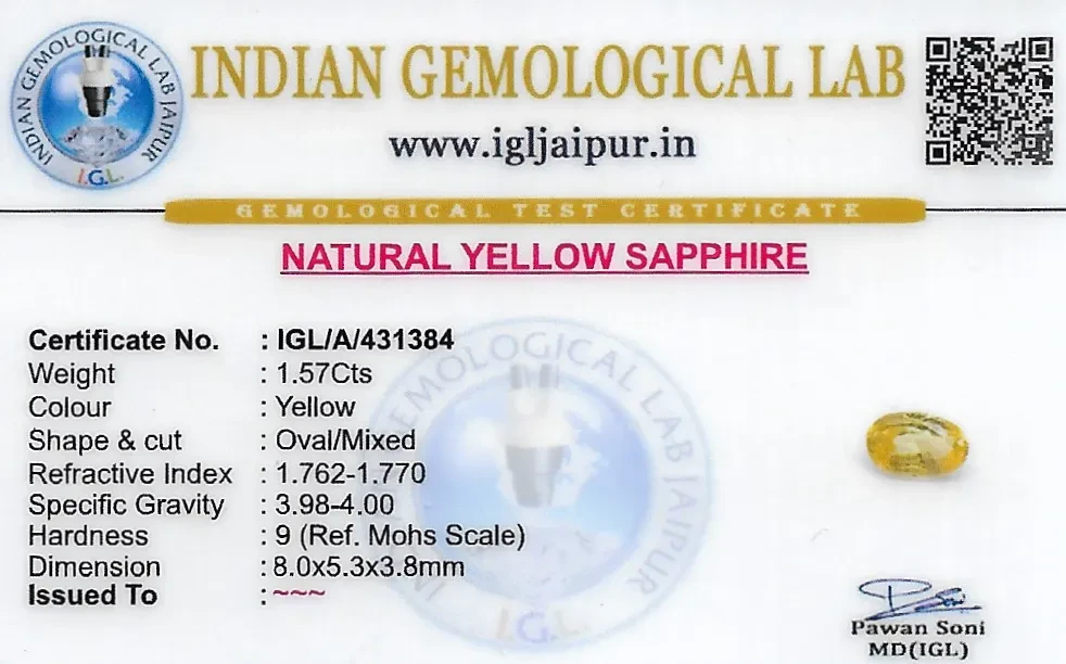 Natural Yellow Sapphire (Pukhraj) weighing 1.57 carats In Oval from Sri Lanka (Ceylon)