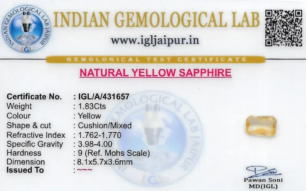 Natural Yellow Sapphire (Pukhraj) weighing 1.83 carats In Cushion from Sri Lanka (Ceylon)