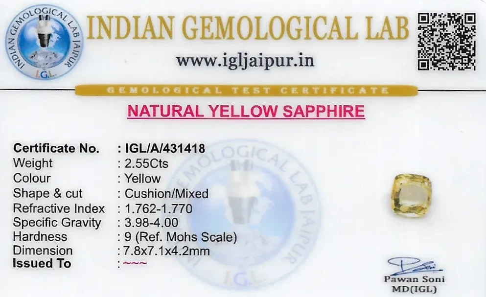 Natural Yellow Sapphire (Pukhraj) weighing 2.55 carats In Cushion from Sri Lanka (Ceylon)