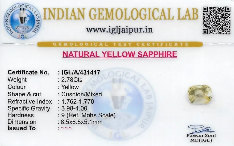 Natural Yellow Sapphire (Pukhraj) weighing 2.78 carats In Cushion from Sri Lanka (Ceylon)