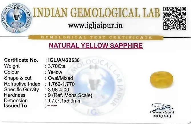 Natural Yellow Sapphire (Pushparag) weighing 3.7 carats In Oval from Thailand
